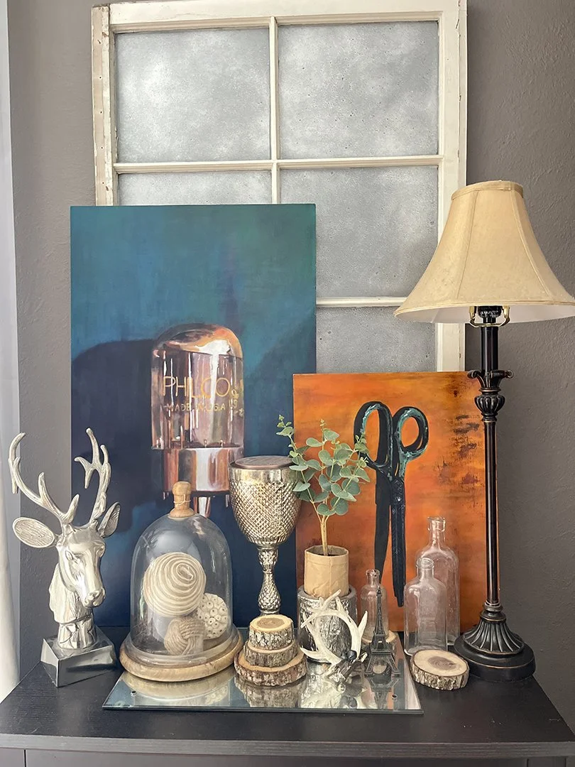 Finally, I brought some cherished paintings from one of my favorite artists into the space to add bold color amidst the old glass and quirky sculptures. Since one of the pieces was commissioned, I definitely felt like a queen as I carefully placed it among my prized antiques.